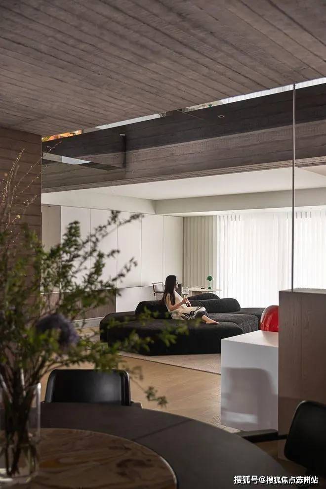 客厅的原建筑是下沉式设计,通过朴实的原木踏步与地面过渡相连,与其他空间产生了视觉上的落差,营造出丰富的层次感。因空间较为高挑,加上低矮的家具选择,在整个下沉式空间中,尺度被放大,视野更加开阔。