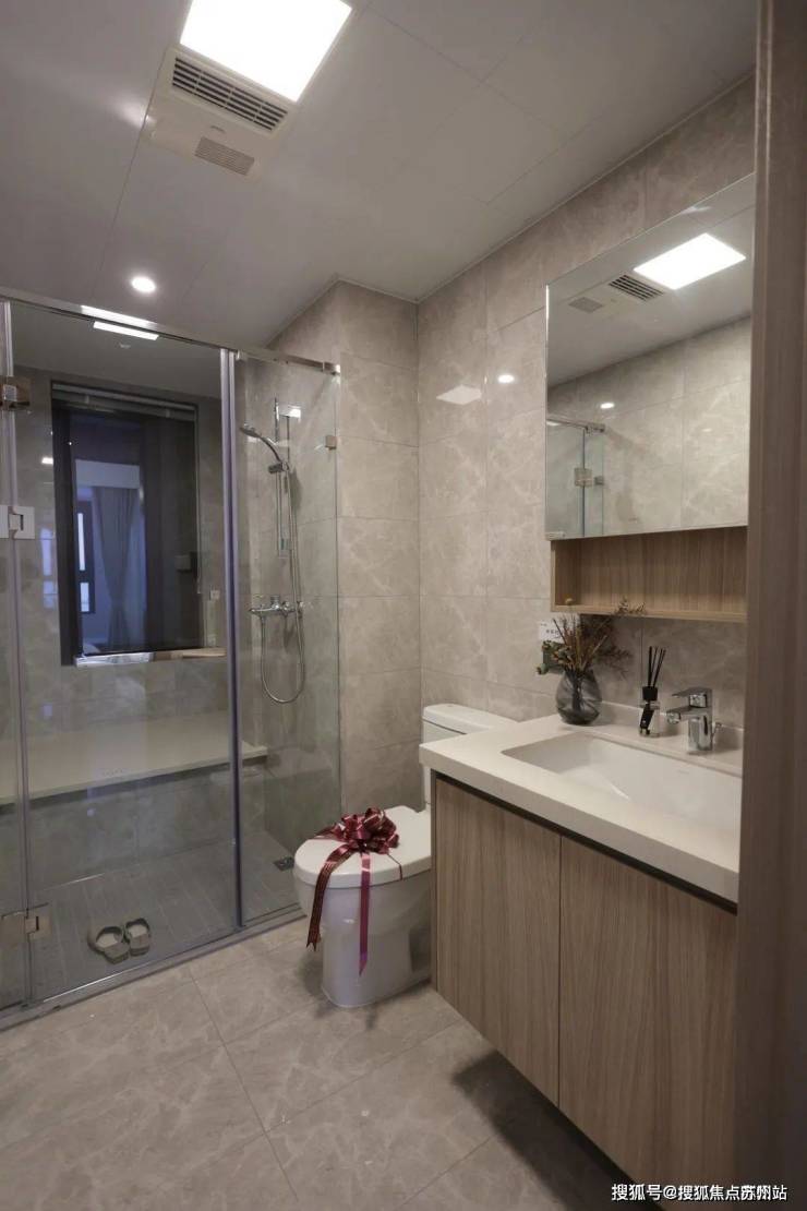 该户型公用卫生间,同样采用洗手洗浴干湿分离的设计;且公卫同样自带飘窗,保证充分通风、避免潮湿的同时,增加了空间利用率;马桶边设置了电源插座,后期可安装智能马桶盖。雅洁清新、细节考量,优越生活尽情乐享。