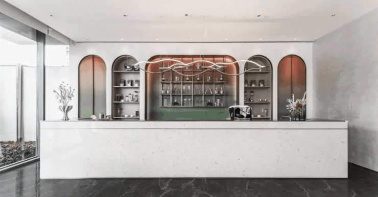 穿越园林步入星级大堂,现代简约的装饰风格,极具设计感的导台,