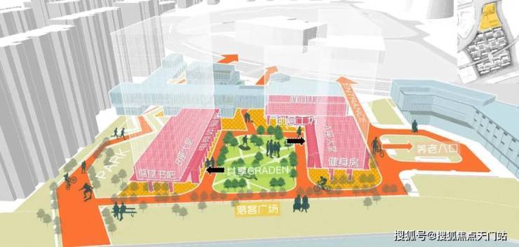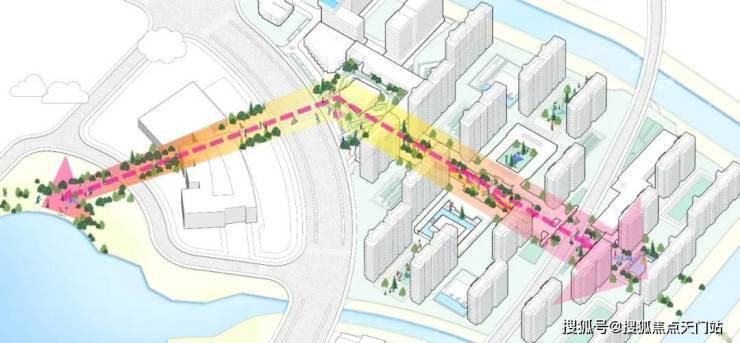 一条连续的公共通廊由海天湖公园引入社区,贯穿三大功能结构区.