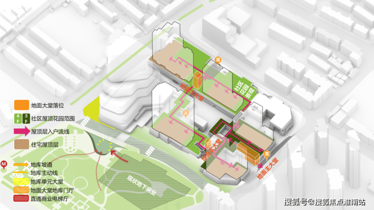 步行体验为每个人规划不同动线;中興傲舍项目,基于人的关系的角度去设计动线,在高混的业态中,为住宅用户创造私密性和独立性,如到达高线公园这一层都有门禁,只有住户能够抵达,从而将简单的道路线条演变为丰富的空间内容:出与入的记忆、城市与社区的联系、公区与私域的桥梁。