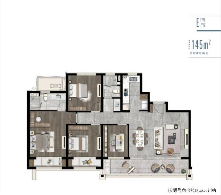 方正户型:全明通透,3+1开间朝南,轻松拥揽四季景致;