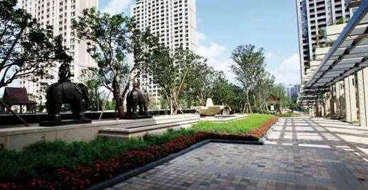 内部的景观,品尊国际也以现代东南亚景观为主,在中轴线上设置了大量的景观绿植以及雕塑、工艺灯笼、雕饰景墙等。