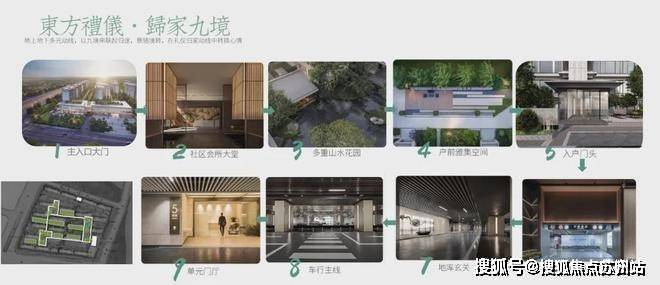 九重归家动线:社区入口双层酒店式形象门楼——(地上归家)社区会所大堂、多重山水花园、楼前雅集空间、单元大堂——(地下归家)地库出入口、地库玄关、车行主线、地下层单元大堂