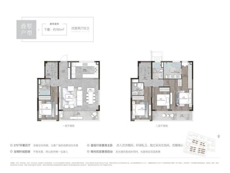 上叠225㎡,四室两厅四卫,视野更开阔。
