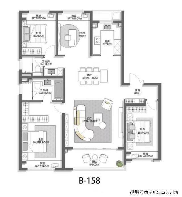 同样是5开间朝南,南向面宽拉升至约21m!甚至阔气到将两个次卫都放在了南面,3卫全明!