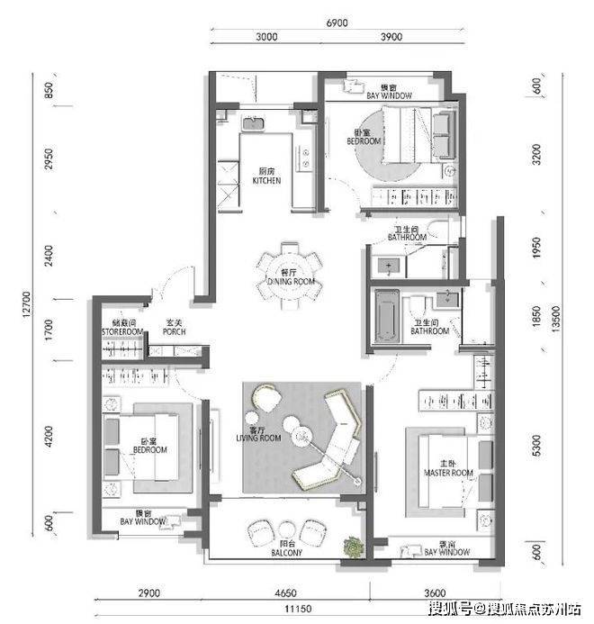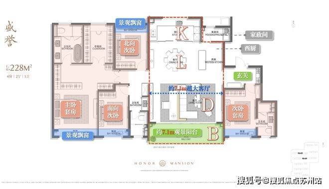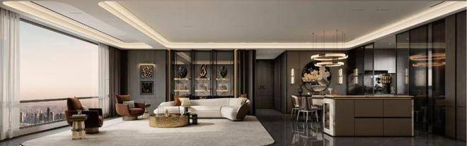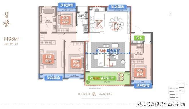 餐客厅阳台组成LDKB超大社交方厅,近80㎡的奢阔,约6.9m的客厅加上三个卧室,近乎是5开间朝南。