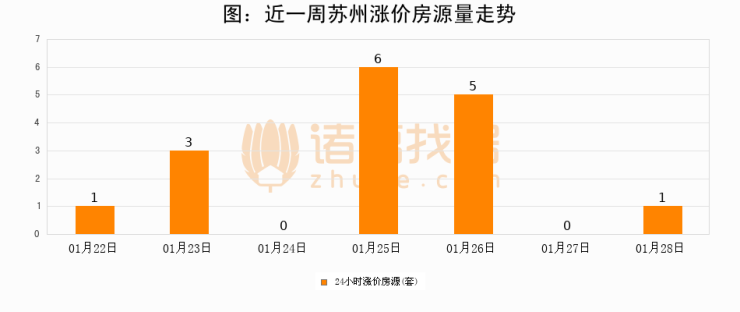 根据诸葛找房数据显示,苏州24小时涨价房源量为1套,较01月27日增加1套,环比上涨0%。与此同时,涨价房源占比小幅扩大,业主信心有所提升。