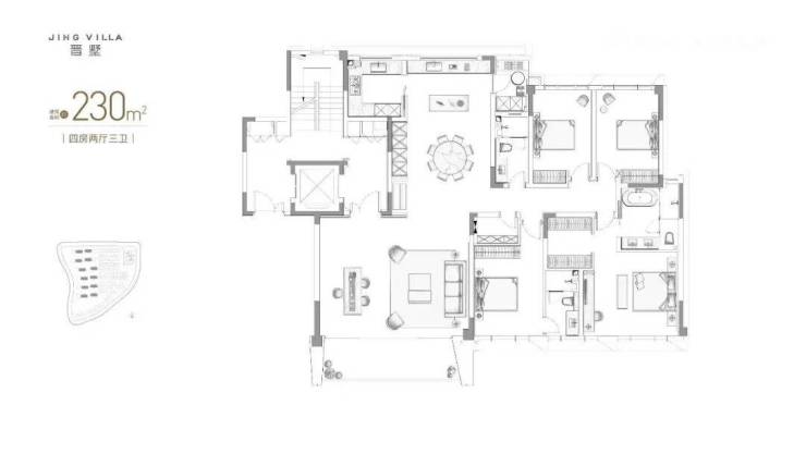 先看洋房建面约230平米户型,动静分明,公区足够奢阔。4房3卫,南向总面宽达到了17.3米,中西双厨,豪华主卧套。