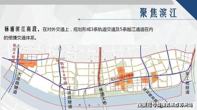 交通方面:杨浦滨江已有3轨5隧道交通格局,4/12/18号线环伺,坐拥江浦路隧道、杨浦大桥等,未来更有24、26号线规划中,交通能级领先。