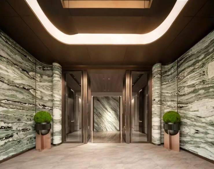 在星级酒店式的单元大堂,铝板飞檐如裁云作玉璜。大门两侧的碎切维多利亚绿奢石纹理独特,如翡翠冻层叠湖底;搭配透光云石背景墙,又似春湖冰层初破时漫溢的潋滟,将“水琢玉成”的哲思凝为具象艺术。