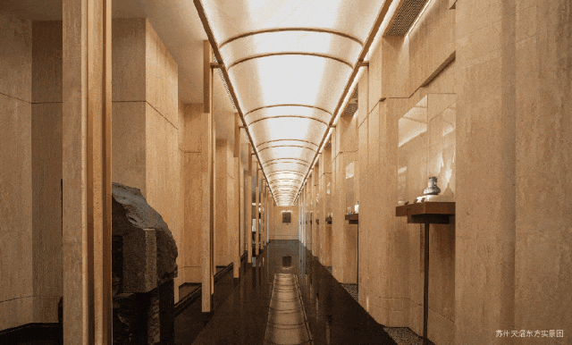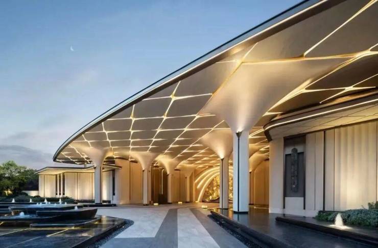 八方立柱撑起玉兰花瓣裂解穹顶。采用的是UHPC材料,卢浮宫同款,成本是普通石材的3倍,更是高级感的代名词。当你抬头,试图透过大门的穹顶寻找当晚的月色,你就浑然成为那个在满地六便士上抬头望月的人。