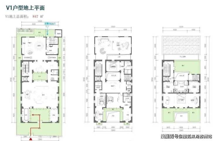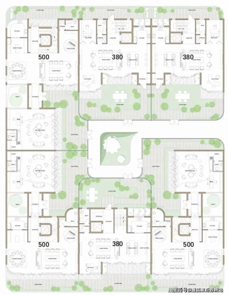 别墅面积段大概在380-500㎡,组合形式不同于市面上常见的联排、双拼。而是一种围绕中心/社交景观,呈围合式布局的创新方式。