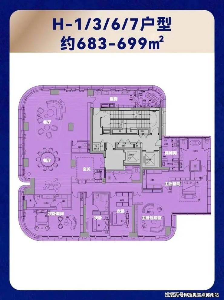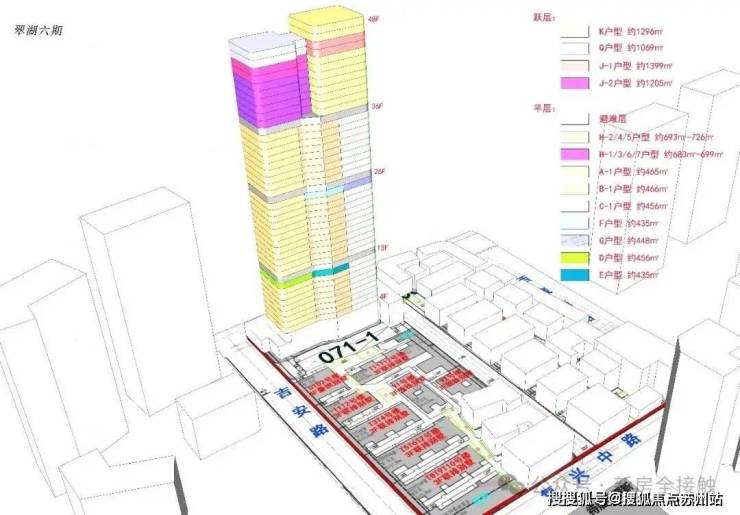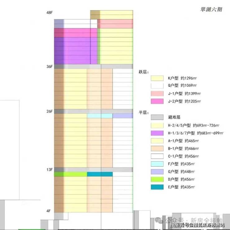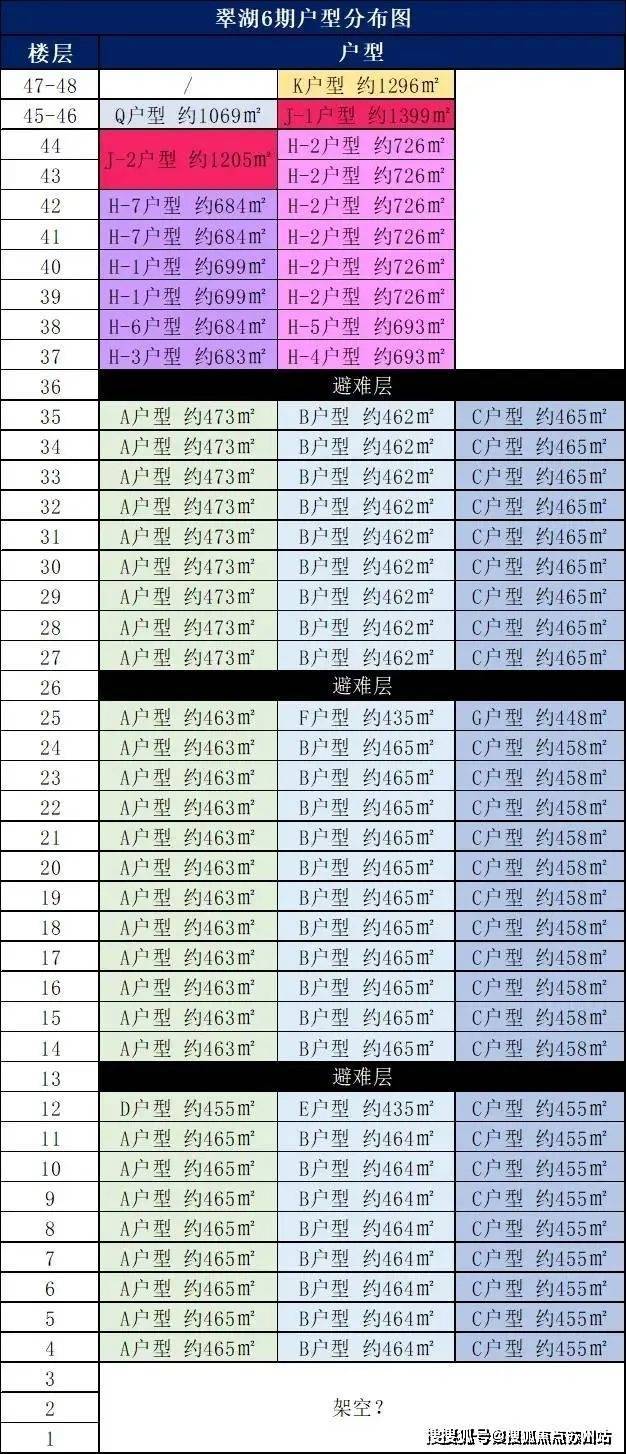 6期的得房率在73-74%左右。共48层、总高度180米的超高层住宅分被为高区和低区两部分。35层以下是一层三户,35层以上是一层2户的大平层以及少量的顶复户型,并且层高全部在3.6米。