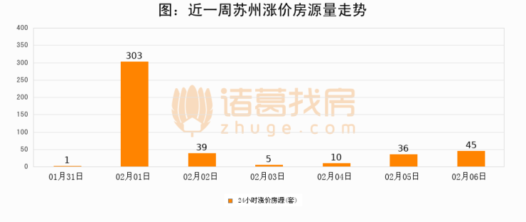 根据诸葛找房数据显示,苏州24小时涨价房源量为45套,较02月05日增加9套,环比上涨25%。与此同时,涨价房源占比小幅扩大,业主信心有所提升。