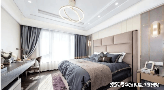 精致镂空床头柜,金属元素的点缀和背景墙金属线条形成呼应,用来营造空间的轻奢质感。
