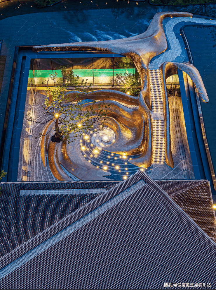 而整个景观场域,最引入瞩目的无疑是示范区节点主景观、下沉庭院中庭景致“两宜来”,取意于《永乐大典·乐章》“箫韶九成凤凰来仪”,箫韶之曲连续演奏,凤凰也随乐声翩翩起舞.