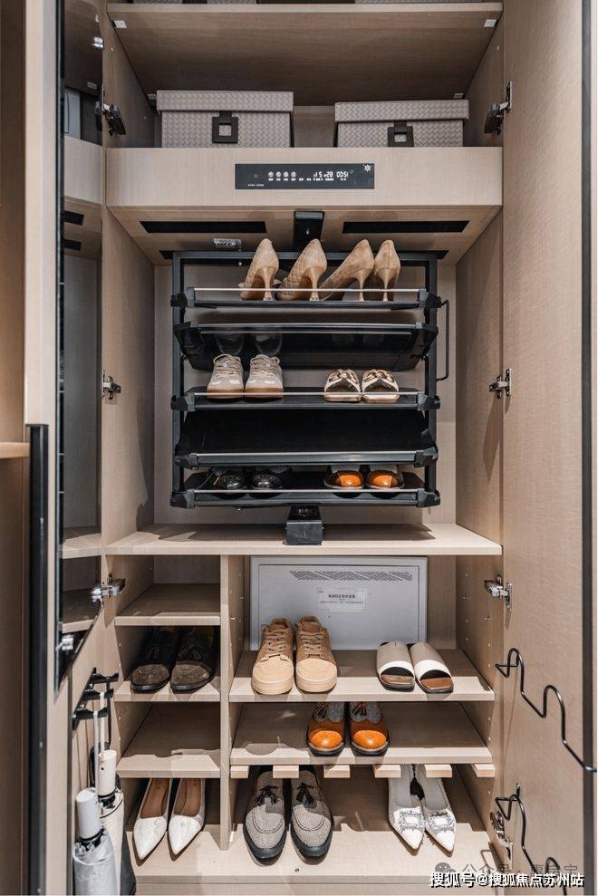 钢木复合入户门隔绝外界喧扰,品牌智能门锁多种方式便捷归家。美观实用的玄关柜内含旋转鞋架/消毒精灵等多功能设置,搭配精致金属壁龛,带来别具一格的空间观感。