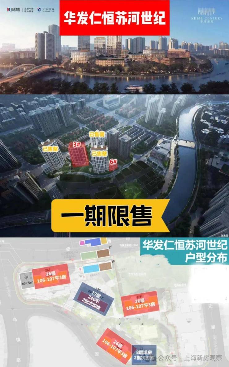 静安内环苏州河板块「华发仁恒苏河世纪」二期即将加推的是3#、6#两栋住宅,共44套。主力建面102-245㎡3-4房,另有6套大平层和2套复式。具体如下:16套约102㎡3房、20套约245㎡4房、6套约495㎡大平层、2套约499㎡复式。