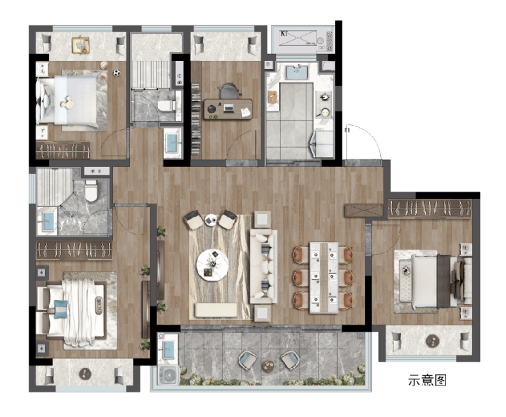 约143㎡(两种格局): 进阶之选,可灵活打造4+1房,满足二胎或三代同堂。约15米南向面宽,三个卧室朝南,搭配约6-7米观景阳台,尺度感堪比别墅。