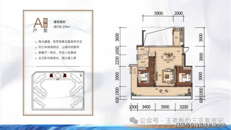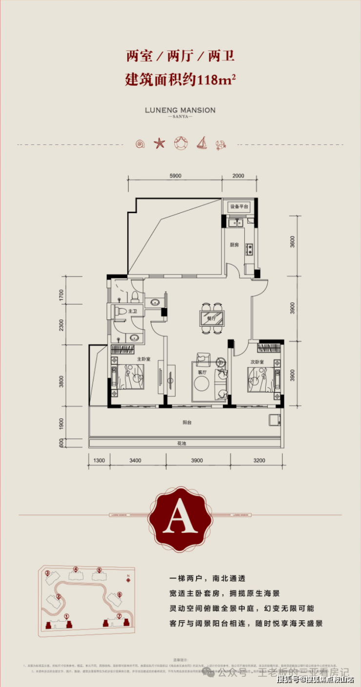 在售E23地块鸟瞰及经济指标瞰海小高层住宅:A户型:118㎡2房2厅2卫