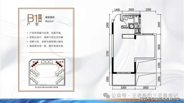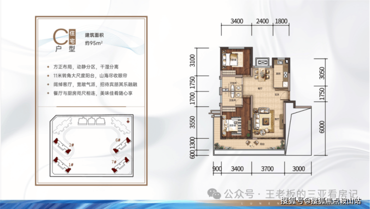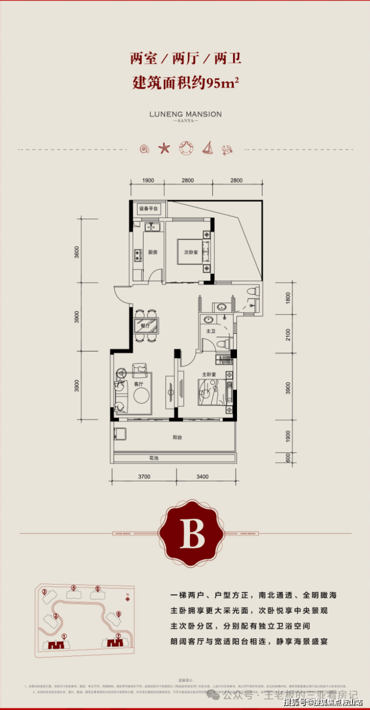 B户型:约95㎡2房2厅2卫(幻变3房),延展后可使用面积约118平米,南北双阳台