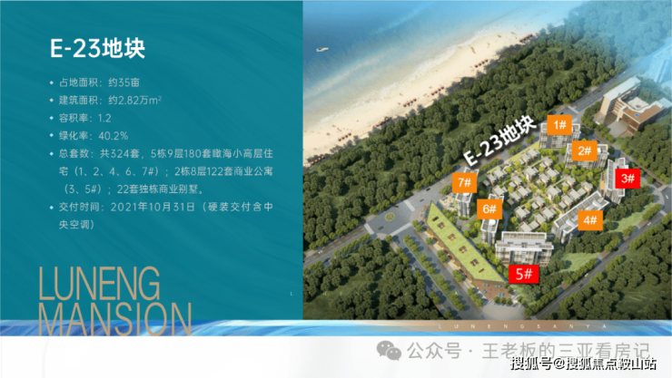 开发商:中国绿发在售地块:E15地块占地面积:42亩建筑面积:约3.42万㎡绿化率:约40%容积率:约1.2总套数:E15地块320户,其中1/7号楼120户交房时间:现房(硬装交付含中央空调)物业费:4.8元/㎡在售户型:约95-118㎡亲海公馆