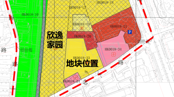 HK0018-33地块位于纪念路北侧,靠近逸仙高架路;地块形状不算规整,东侧紧邻HK0018-34地块,规划为社区医疗卫生用地;西侧是保留的现有住宅,欣逸家园。