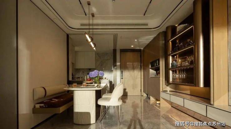 保利光合跃城营销中心:400-8123-664☎样板房的整体用材和工艺也很有惊喜,样板房用到了不少的奢石及复杂工艺。比如说,圆弧形吊顶让空间更具柔和美感,金属线条提升空间的层次感,细节之处精致考究。