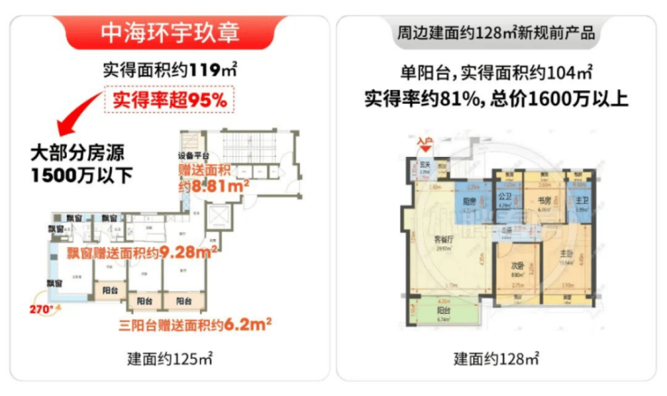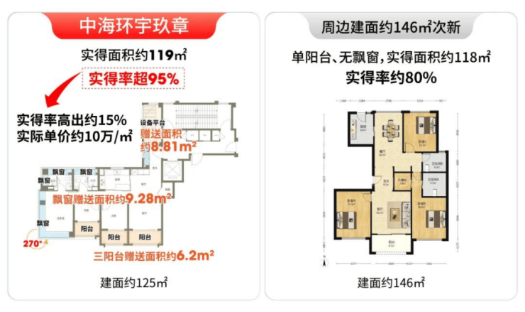 环宇玖章125户型实得率超95%,而宝华项目实得率仅约80%。按同等实用面积折算,环宇玖章实际单价就更划算,仅约10万/㎡。