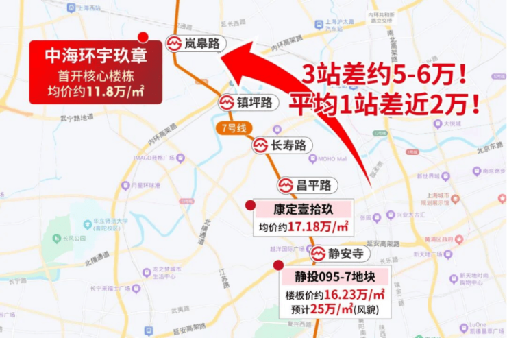 环宇玖章与17.18万/㎡的康定壹拾玖只差3站,但这3站均价却差5-6万/㎡。