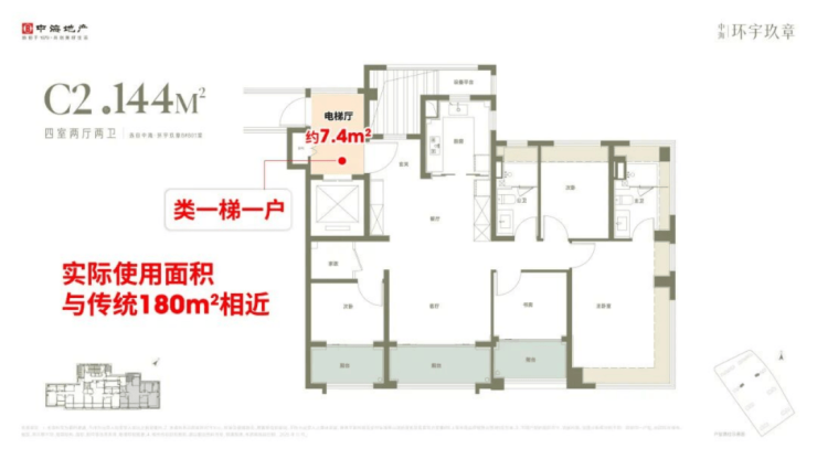 ②、144㎡户型本身实得面积约133㎡,加上专属电梯厅后,整体可用面积可达约141㎡,这一空间尺度已与市面上二手180㎡户型的可使用面积相近。