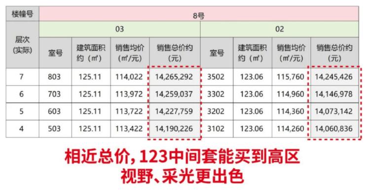 其次,其均价仅约11.2万/㎡,且楼层价差比边套更小,大部分房源总价控制在1400万内。更具吸引力的是,中间套高区价格与边套低区相近,却能享受整栋楼更优的采光和视野条件,用更低成本锁定更高价值。