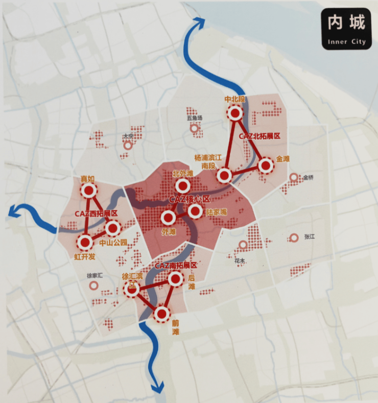 从设计方案中可以看到,上海内城将会形成以“外滩-陆家嘴-北外滩”为中心的CAZ核心区。