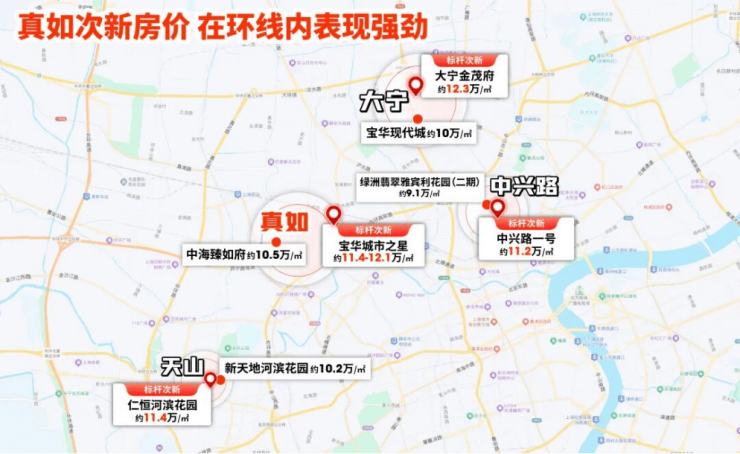 值得注意,目前真如、大宁、天山的次新房价基本持平,普遍在10-12万/㎡区间,说明这些板块当下的市场价值相近。
