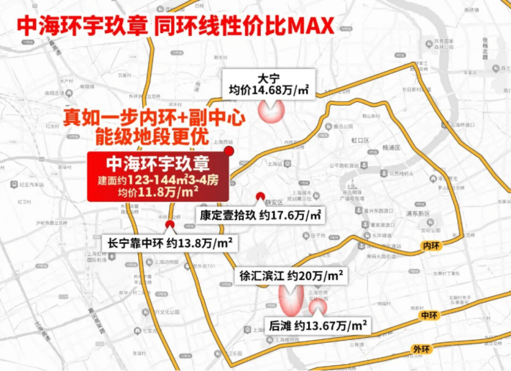 大宁新房整盘均价14.68万/㎡;天山新房均价13.68万/㎡;后滩13.67万/㎡;更别说世博、徐汇滨江奔向20万/㎡。