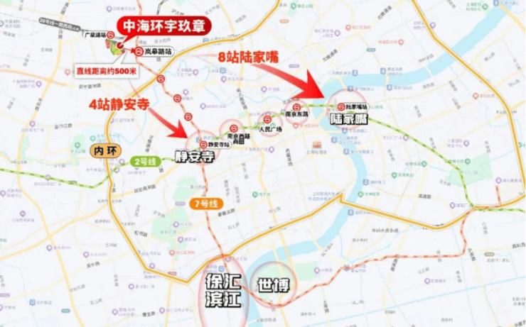 环宇玖章直线距离20号线广泉路站(在建)约400米,距7号线岚皋路站约500米,4站静安寺、5站南京西路,通勤便捷度远超同价位区域。