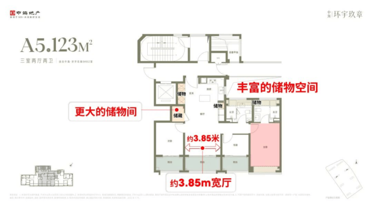 户型设计上,中间套客厅拥有3.85米的开阔面宽,并配备同级更大尺度的储藏间及丰富储物功能,兼顾采光、收纳等实用需求。