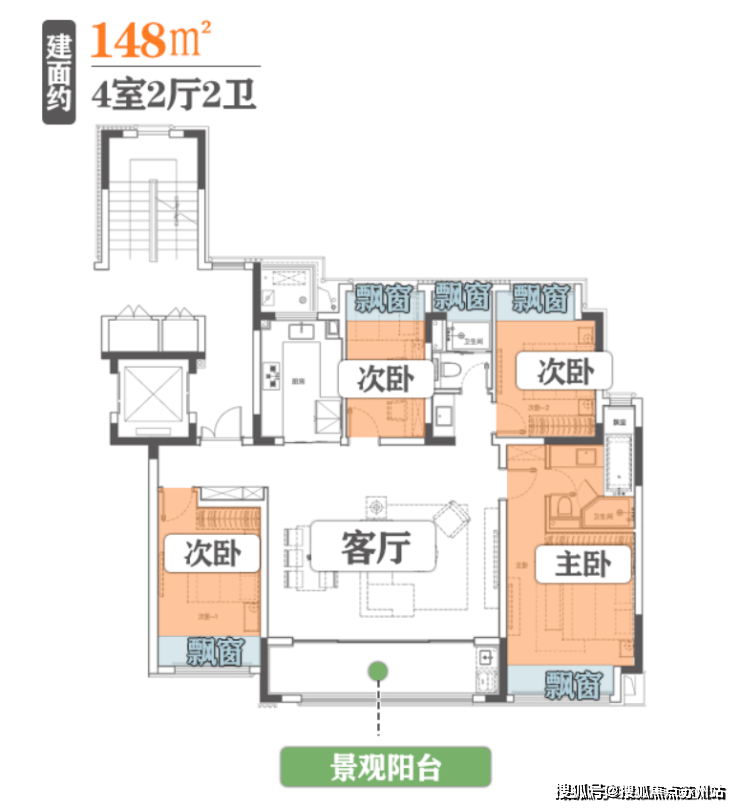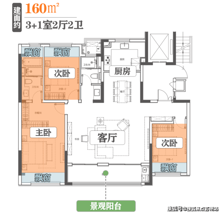 以建面约160㎡户型为例, 私享入户前厅、独立玄关、全屋飘窗,并且约7米长的豪华横厅,空间感强烈。
