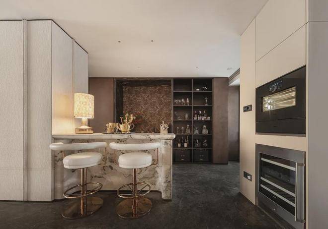 厨房内竹纹夹丝玻璃门、威乃达坡璃烤漆橱柜、与卡拉拉金大岩板台面相融,同时嘉格纳十件套满足每一种味蕾的偏好,厨房内,灶台/油烟机/洗机/冰箱(独立分体设计)五件套;向外,嘉格纳咖啡机/暖碟机/酒柜/烤箱/蒸箱等西厨五件套配置,构筑中西共融的烹饪场域。