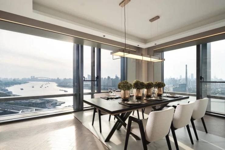 在厨房、在餐厅和客厅,还有在书房,你看到的景色如此多元。可以是阳光映射下的黄浦江美景、可以是壮丽的南浦大桥、可以是造型独特,宛若飞碟般的梅赛德斯奔驰文化中心,还可以是上海地标陆家嘴三件套。