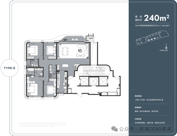 约240㎡4房产品,是典型的大面宽设计,临江面宽高达16米+,超大面宽客厅结合弧形阳台,搭配着270°大面积宽幅全高玻璃窗,将整个滨江景观尽收眼底!