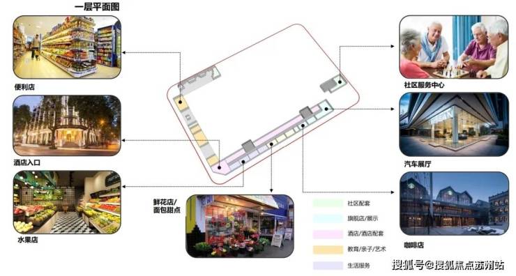 其中一层主要业态有便利店、水果店、咖啡店、汽车展厅以及社区服务中心。