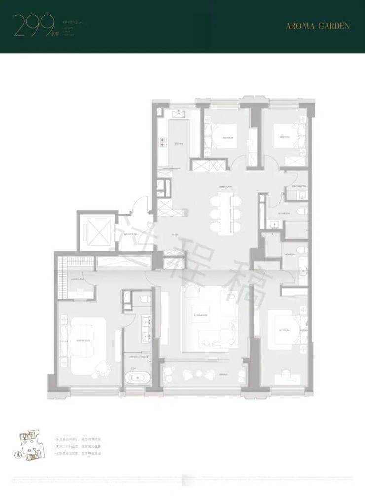 建面约299㎡,南向双套房,尤其主卧是豪华套房,带独立衣帽间,卫浴间含双台盆+淋浴+浴缸+马桶四件套.