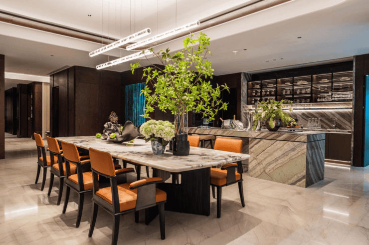西厨吧台更是匹配了符合空间调性的东方木纹与龙飞凤舞石材,独特的纹理和质感提升了厨房品质与艺术性.