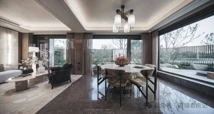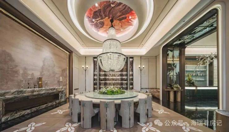 首先是奢石含量极高,从入户处的玲珑玉拼花与透光云石辉映,到翡翠绿奢石墙景、再到发光云石装饰点亮归家路,石材的典雅贯穿始终。