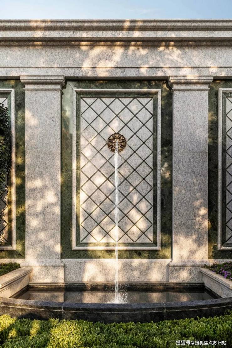 在水镜玫瑰园,绿城·苏州玫瑰园将玫瑰花球雕塑,作为园林的视觉中心,这一经典造型,源自台湾故宫博物院的“鬼工球”,寓意着“鬼斧神工”。雕塑融合了茛苕纹、玫瑰花纹和基路伯小天使,由全国铸造专利的工匠全手工打造;中庭铁艺坐凳,灵感源自凡尔赛宫土卫二格罗夫树林内的长椅,镶嵌更简洁的都铎玫瑰徽章,并内置大马士革花纹手工刺绣抱枕,既雍容华贵,又细腻舒适;定制的纯铜门把手,由锻打铜板衬底,宝格绿奢石镶环,并采用玫瑰纹微雕,极尽工巧,尽显奢华;选用的意大利古董台面,为1960年全手工打造,乃全球孤品;莫奈花园餐桌台,采用意大利卡拉卡塔山脉进口奢石,桌面犹如莫奈花园,餐椅设计灵感源自18世纪的“赫普怀特”,并有金属双花LOGO镶嵌;花瓣演绎的恢弘浮光穹顶,采用手工彩釉玻璃;大堂“玫瑰之恋”壁画,由SRD设计师携手清华美院教授共同创作,采用树脂、金属、彩贝等多种材质,全国限定。