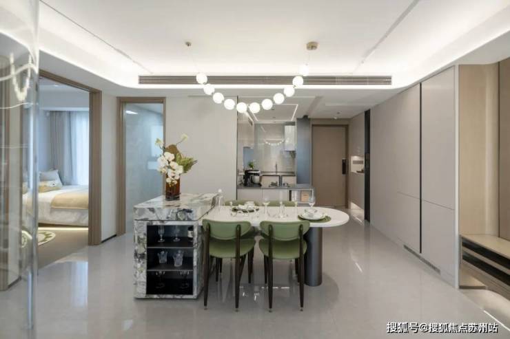 细节方面,厨房额外标配带有收纳柜体的岛台空间,轨道式插座同样是交付标准。