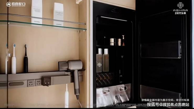卫生间定制的镜柜内的置物架都是所见即所得,未来都是交付标准,美妆冰箱也是标配。并且在台盆下方做了袋鼠抽柜体,下方预留扫地机器人充电点位,比起传统的抽拉柜体更实在。