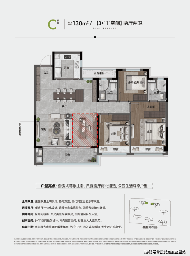 🔸C户型:约130㎡, 【“3+1”空间】两厅两卫